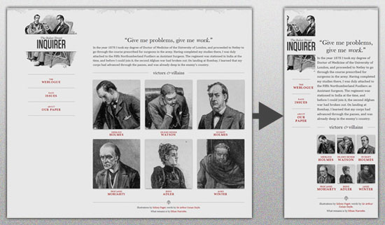下面这张图片是在Ethan Marcotte的文章中,他通过一个实例展示了响应式Web设计在页面弹性方面的特性: